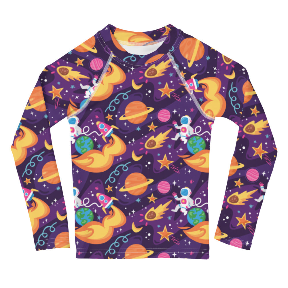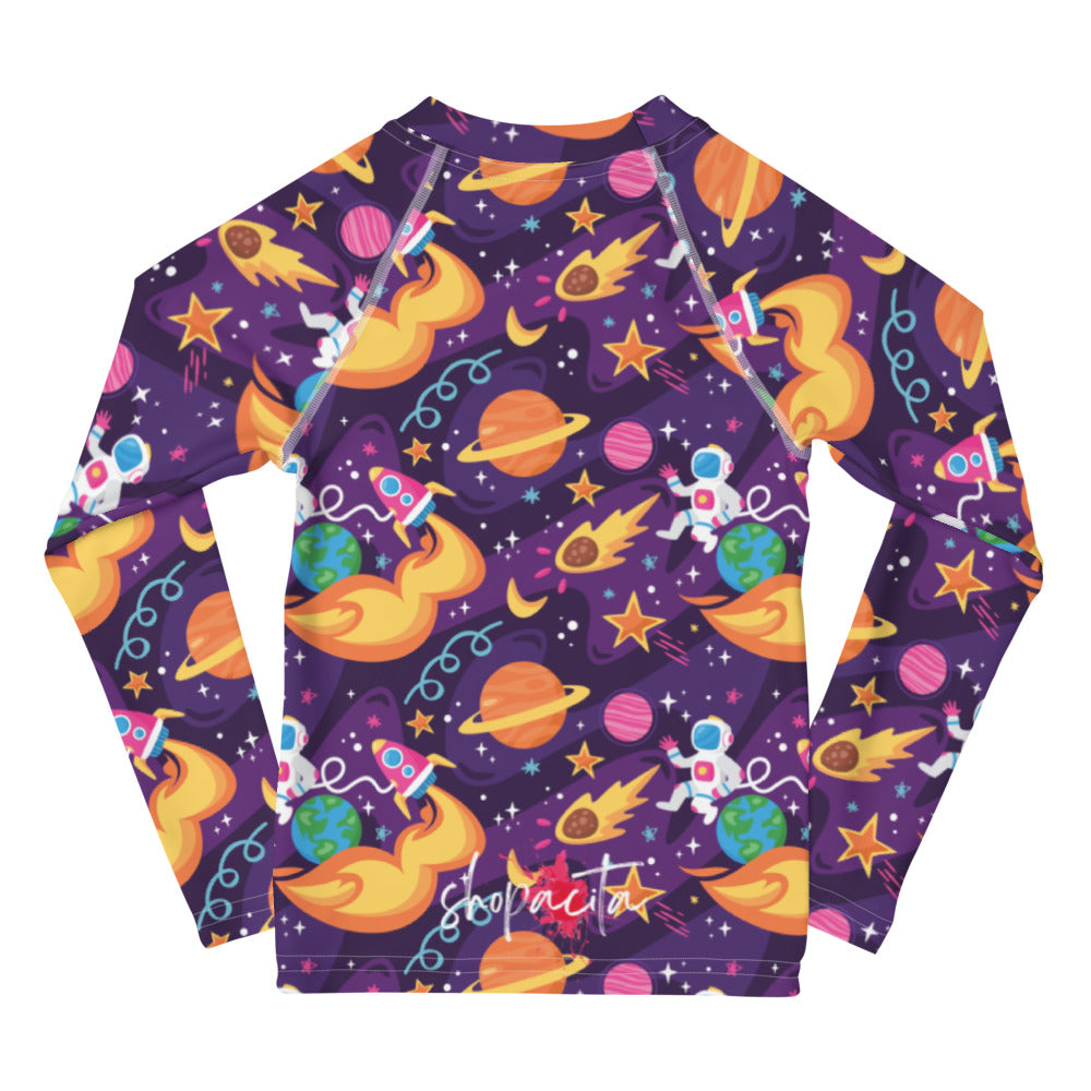 Kids rash guard è un giubbotto protettivo per la spiaggia che protegge i bambini dall'esposizione al sole.