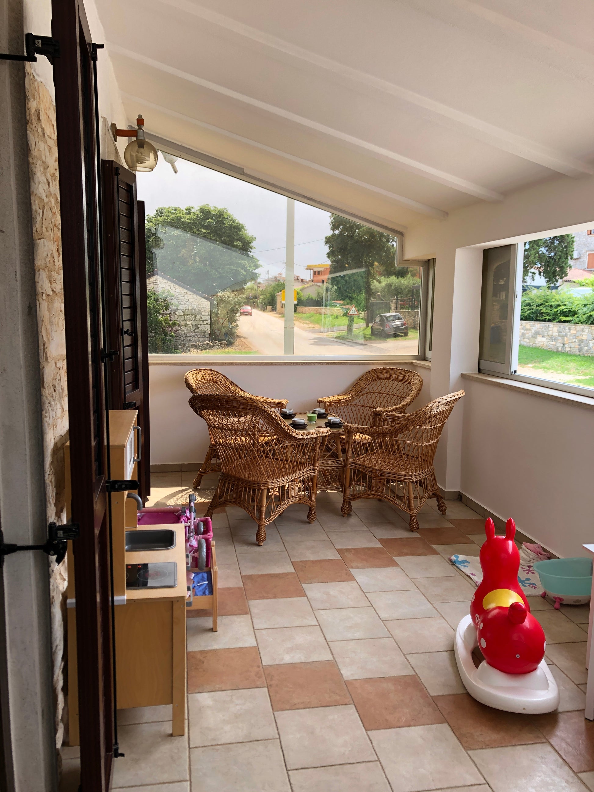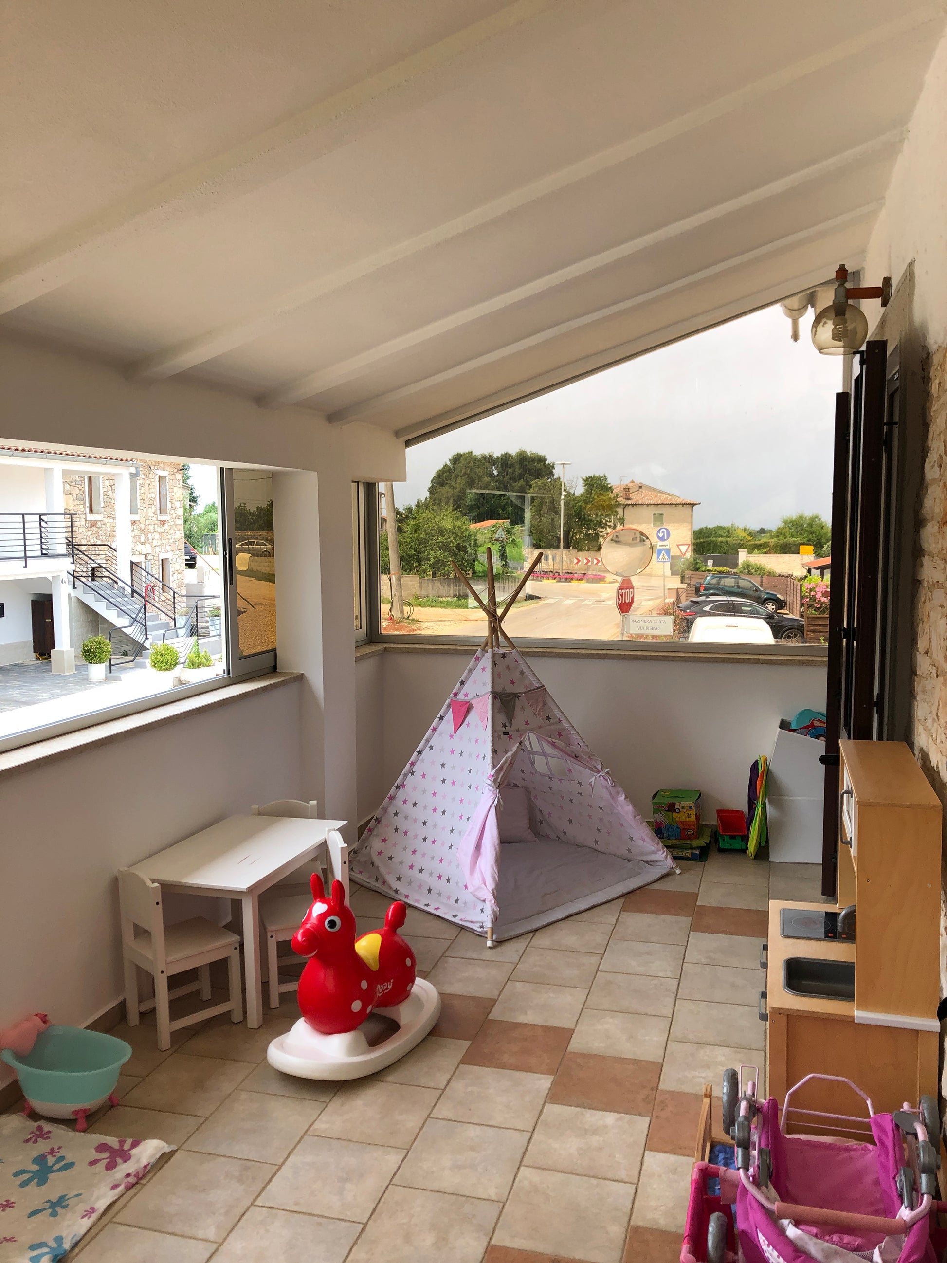 Na zastekljenem balkonu je urejena otroška igralnica s tiki šotorom, leseno kuhnjico, otroško mizico in stolčki, Barbikami, vlakci, plišastimi igračami, sestavljankami,...