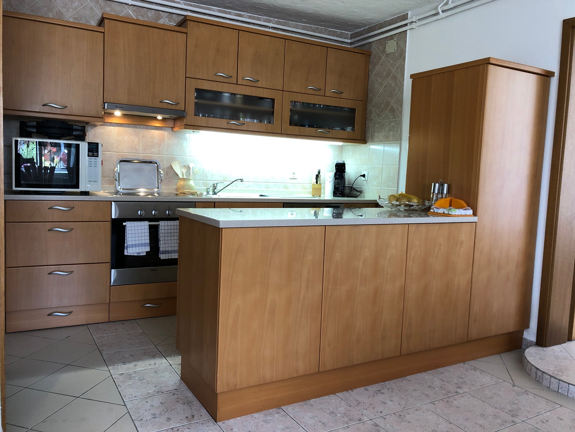 Kuhinja je polno opremljena in ima hladilnik, predal z zamrzovalnikom, indukcijsko in električno kuhališče, pečico, mikrovalnovno pečico, žar toaster, kavomat, penilec mleka,...