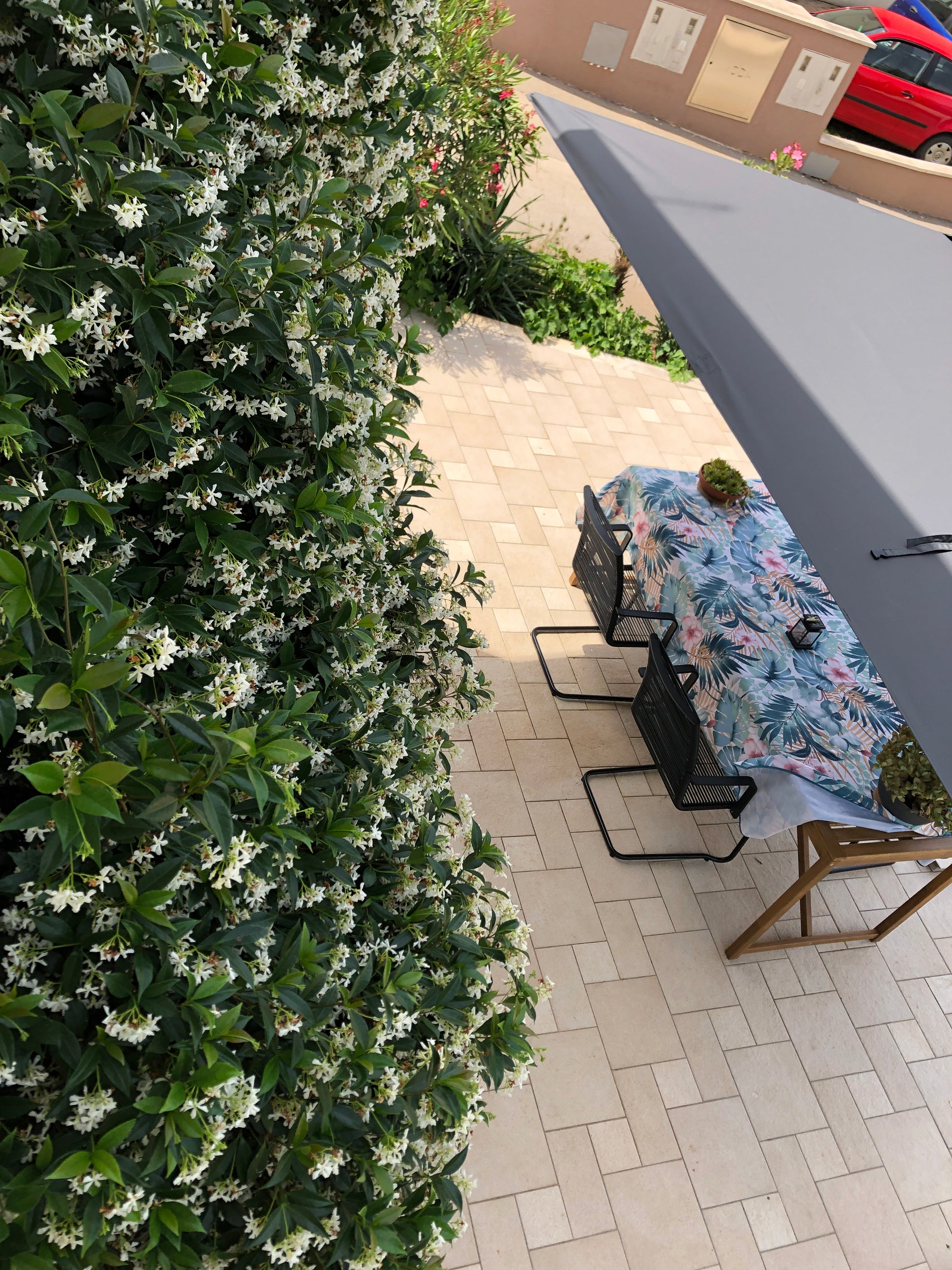 Terasa je opremljena z jedilno mizo in stoli ter velikim senčnikom. Na voljo je tudi ležalnik z blazino.